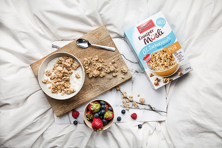 Our Knusperli crunchy mueslis with 0% added sugar* are completely free of sugar additives and are therefore fun to eat! Knusperli pays close attention to the wishes of muesli breakfast lovers and meets the current nutritional needs. With its crunchy mueslis with 0% added sugar, Knusperli helps muesli fans reduce the daily amount of sugar consumed - while still enjoying the crunchy fun!