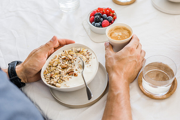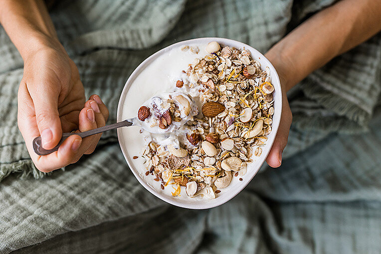 The cereal base of a muesli is often composed of oat flakes, sometimes supplemented by other cereals such as corn flakes. Dried fruit, nuts, seeds and spices provide for a variety of flavors. It depends on your individual preferences whether you eat the muesli with milk, yoghurt, a milk alternative or even fruit juice.